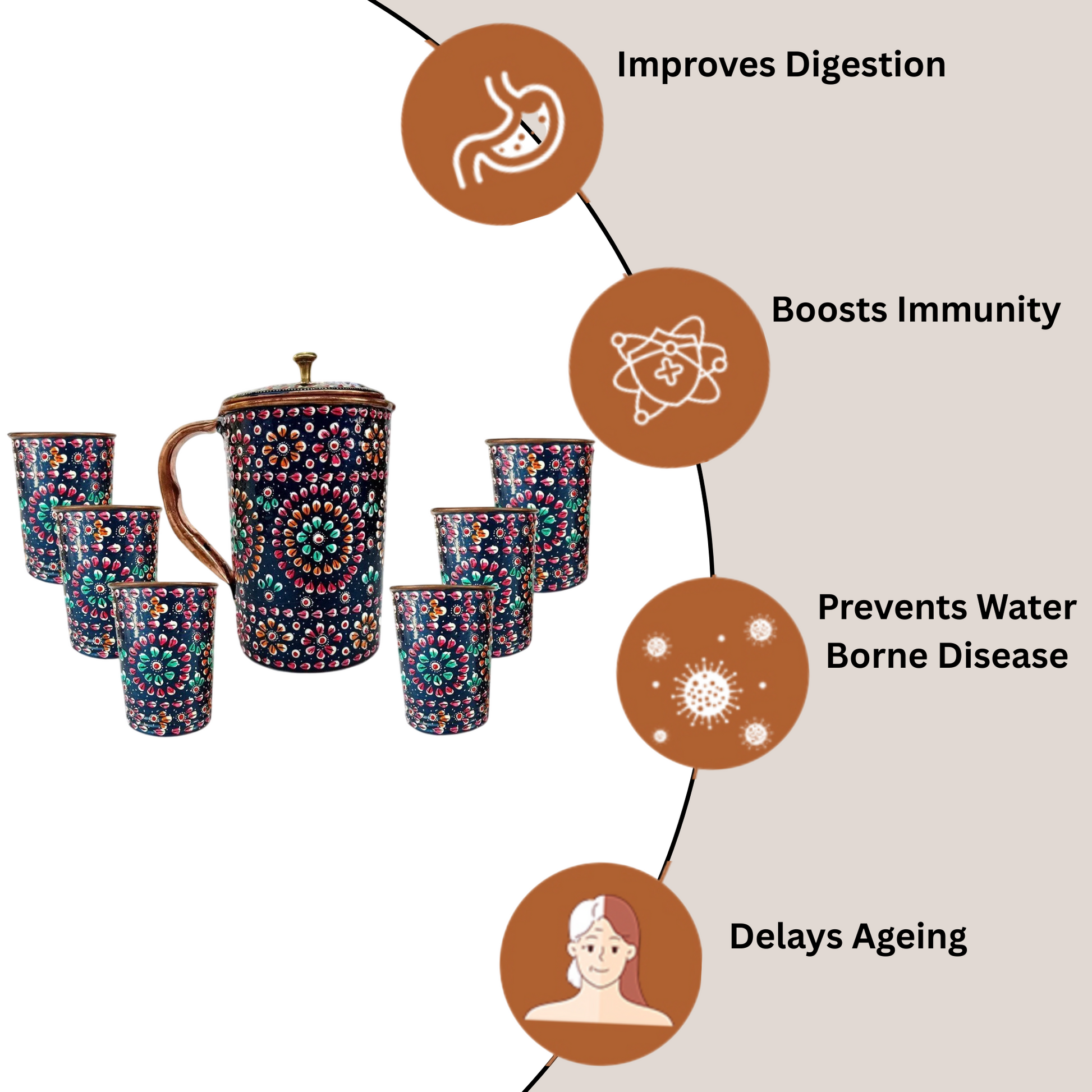 This beautiful pitcher and glass set is made of copper and features a traditional floral design. The set is perfect for serving water, juice, or other beverages. The copper material is believed to have health benefits, such as aiding digestion and boosting the immune system.