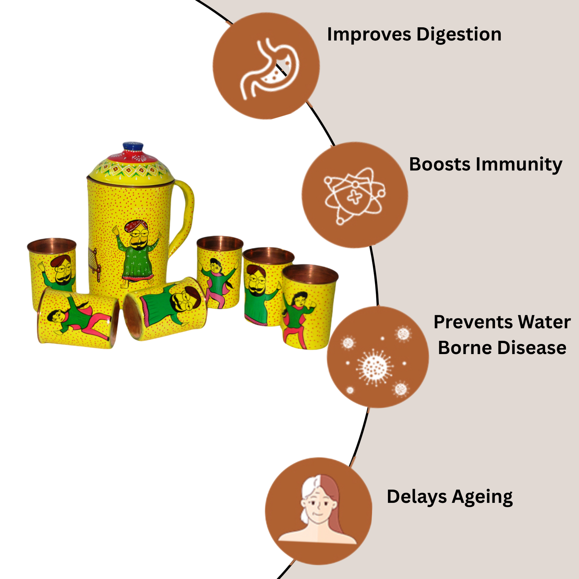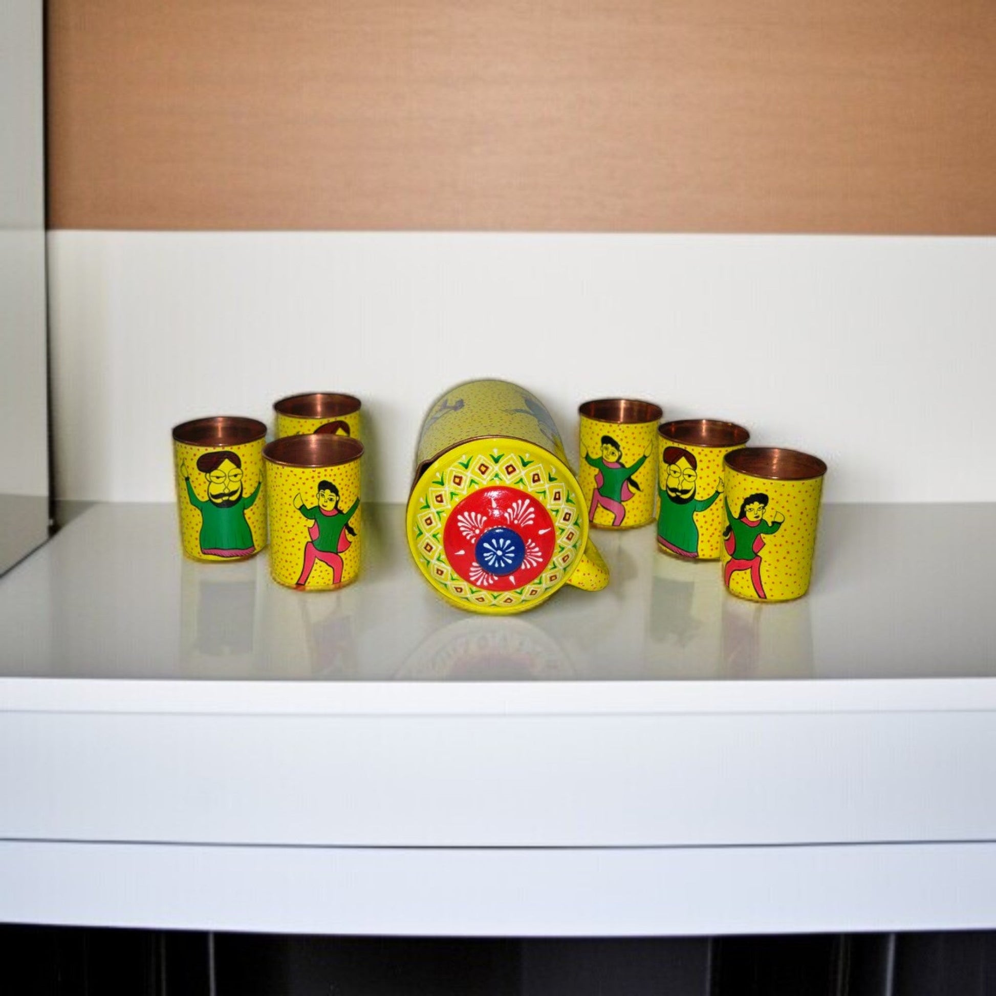 Copper Jug and Glass Set- This cheerful copper jug and glass set is sure to add a touch of sunshine to your kitchen or dining room. The brightly polished copper jug has a gleaming finish that reflects the light, while the six accompanying glasses are made from clear glass with a playful yellow band around the rim.