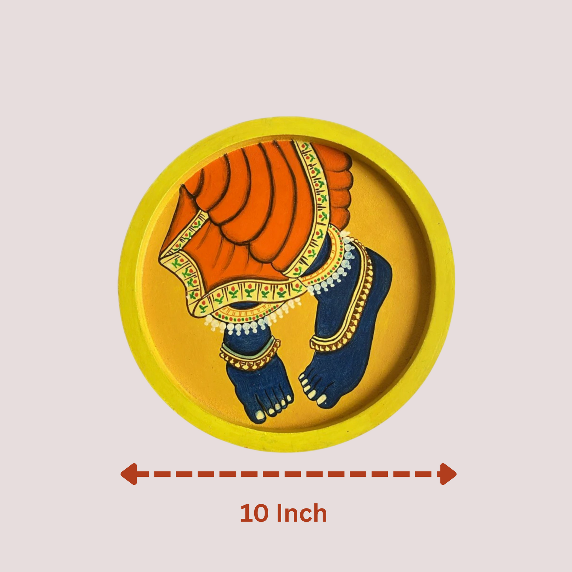 Bring an aura of spiritual serenity and traditional artistry into your home with our "Divine Krishna Feet Hand-Painted Wooden Plate." This exquisite round wall plate features a captivating depiction of Lord Krishna's divine feet, adorned with intricate anklets and a flowing, vibrant dhoti, all set against a radiant yellow background. Each stroke is a testament to the skilled craftsmanship of Indian artisans, making this more than just a decorative piece – it's a window into rich cultural heritage and devotion. Perfect for adorning your prayer room, living area, or any space that could benefit from a touch of divine grace and artistic elegance, this hand-painted wooden plate serves as a beautiful reminder of faith and beauty.