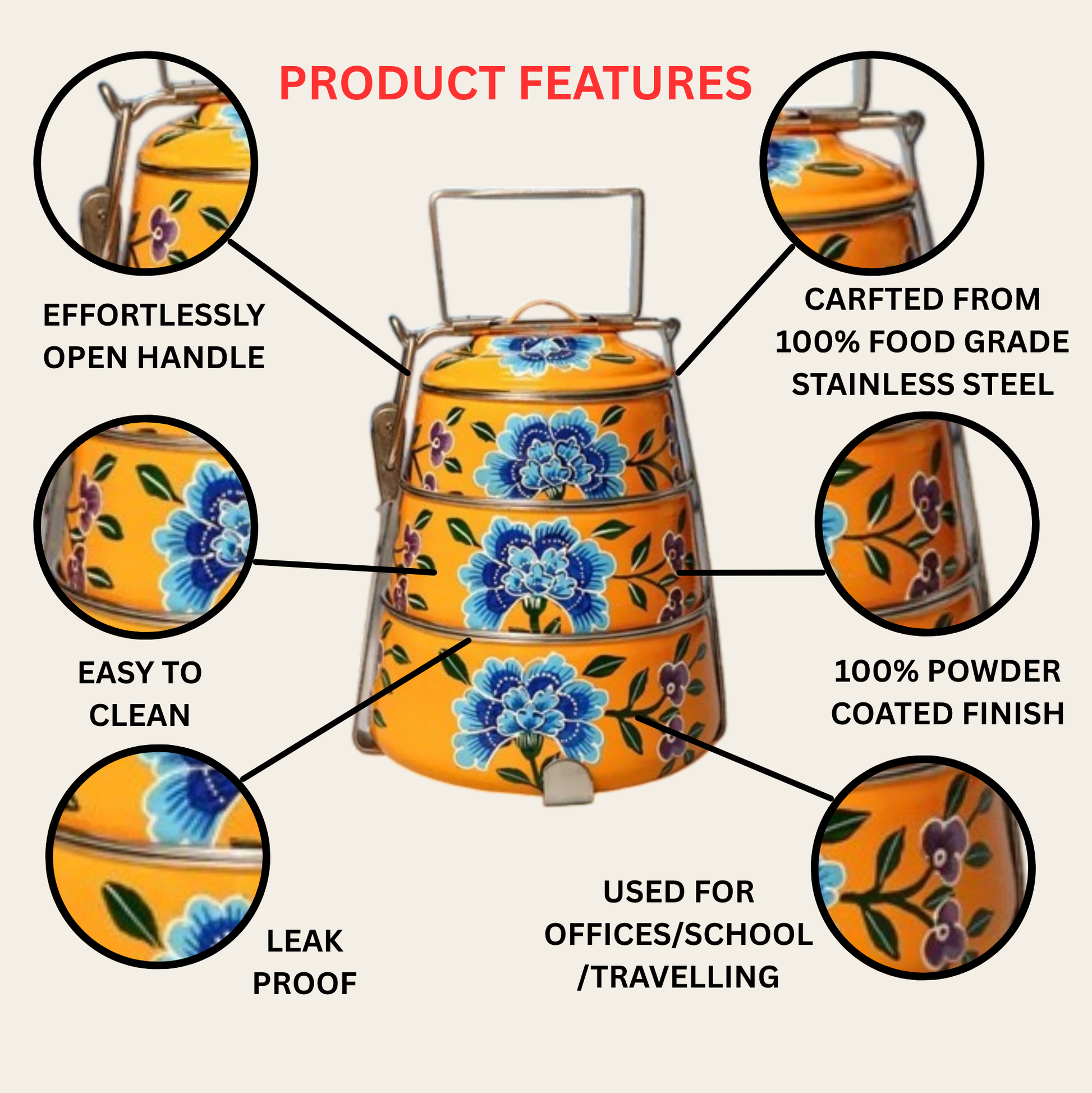 Each tier of this tiffin box is crafted from durable steel, ensuring your meals stay fresh and secure. The three tiers provide ample space for a well-balanced meal, making it perfect for office lunches, picnics, or travel. The secure locking mechanism keeps everything neatly contained, preventing spills and leaks.