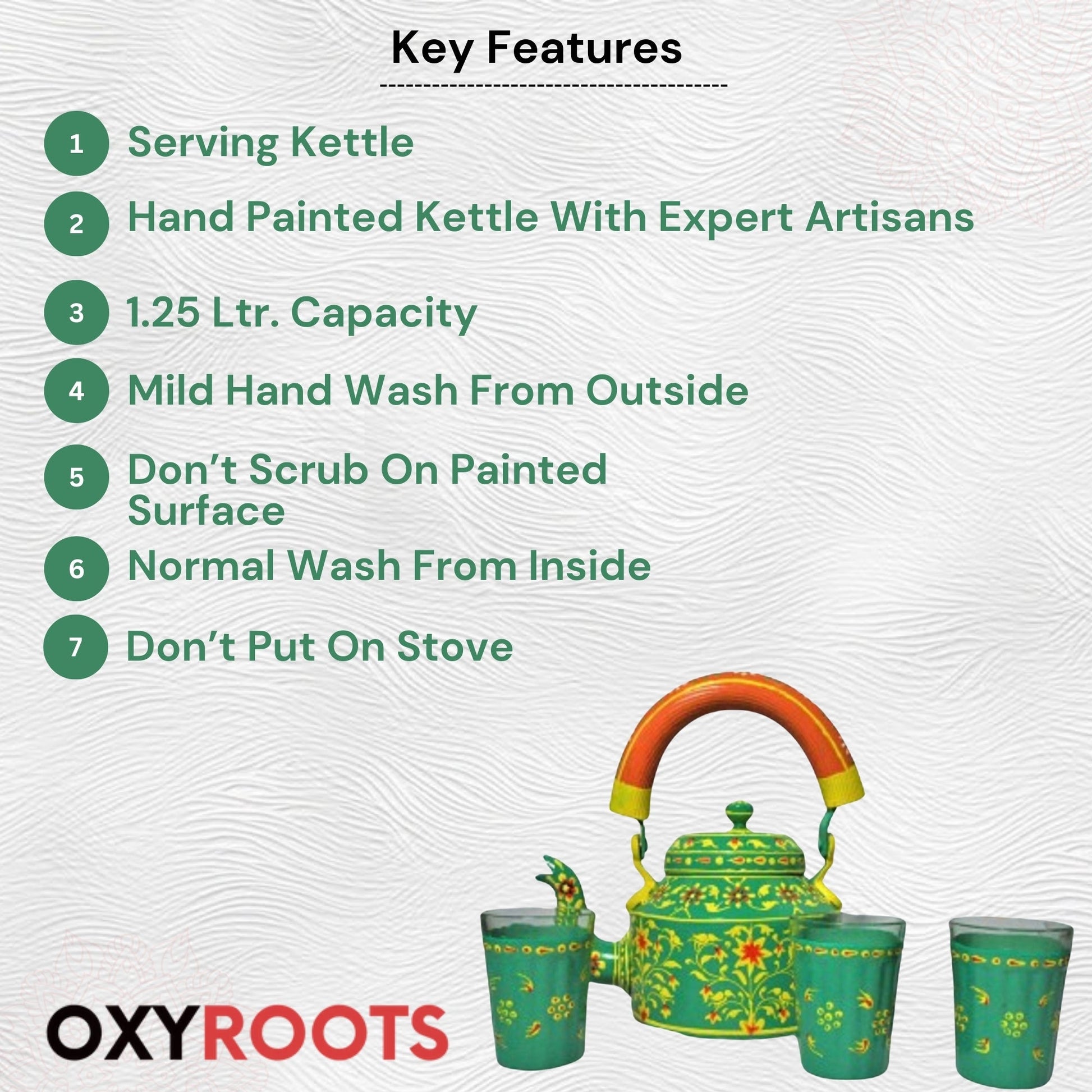Hand-Painted Tea Kettle and Glass Set -Bring a touch of Irish charm to your tea time ritual with this enchanting hand-painted tea kettle and 3 glass set. The kettle is crafted from aluminum and features a deep emerald green base with a delicate white and gold paisley pattern. The three accompanying glasses are made from clear glass and have a simple yet elegant design with a gold rim.