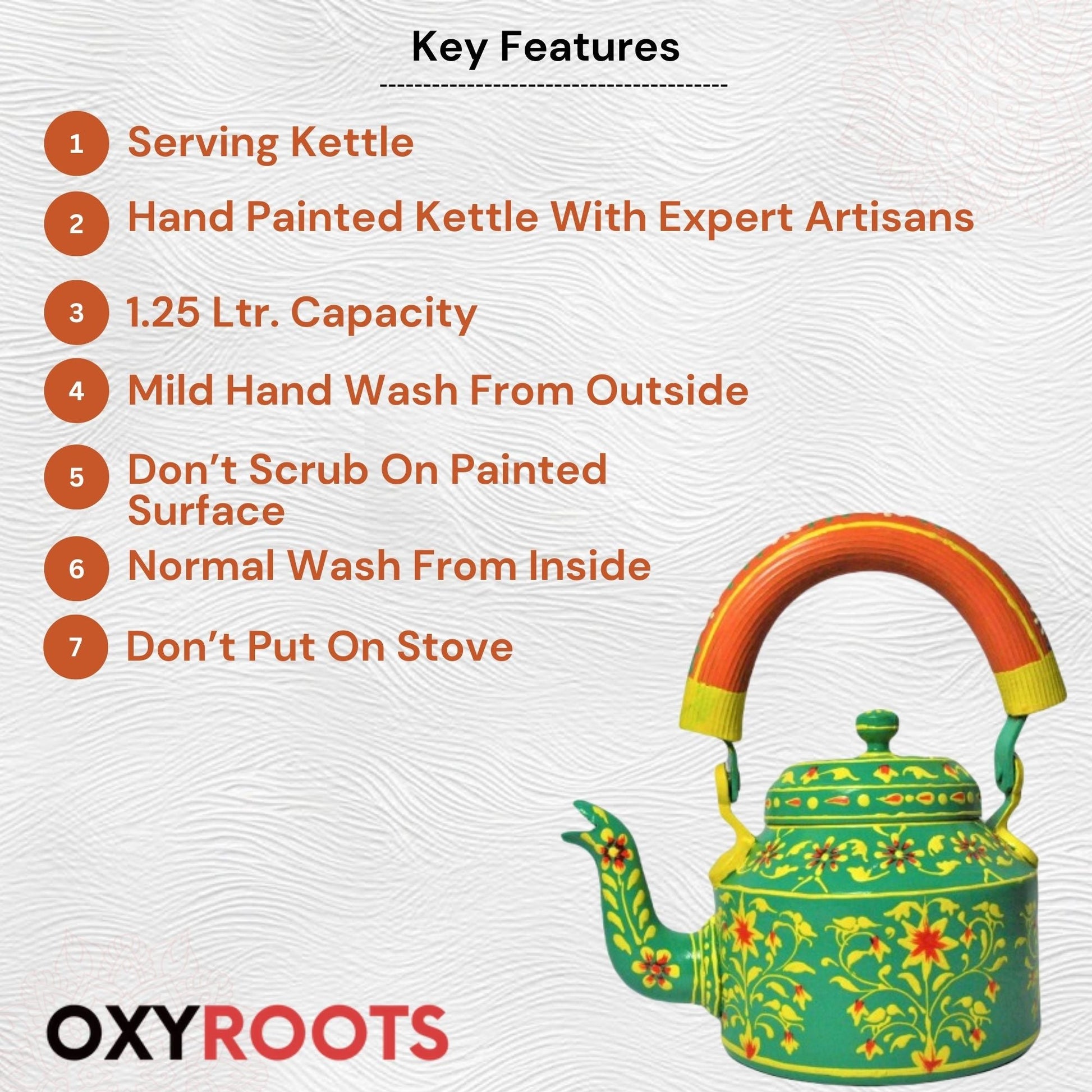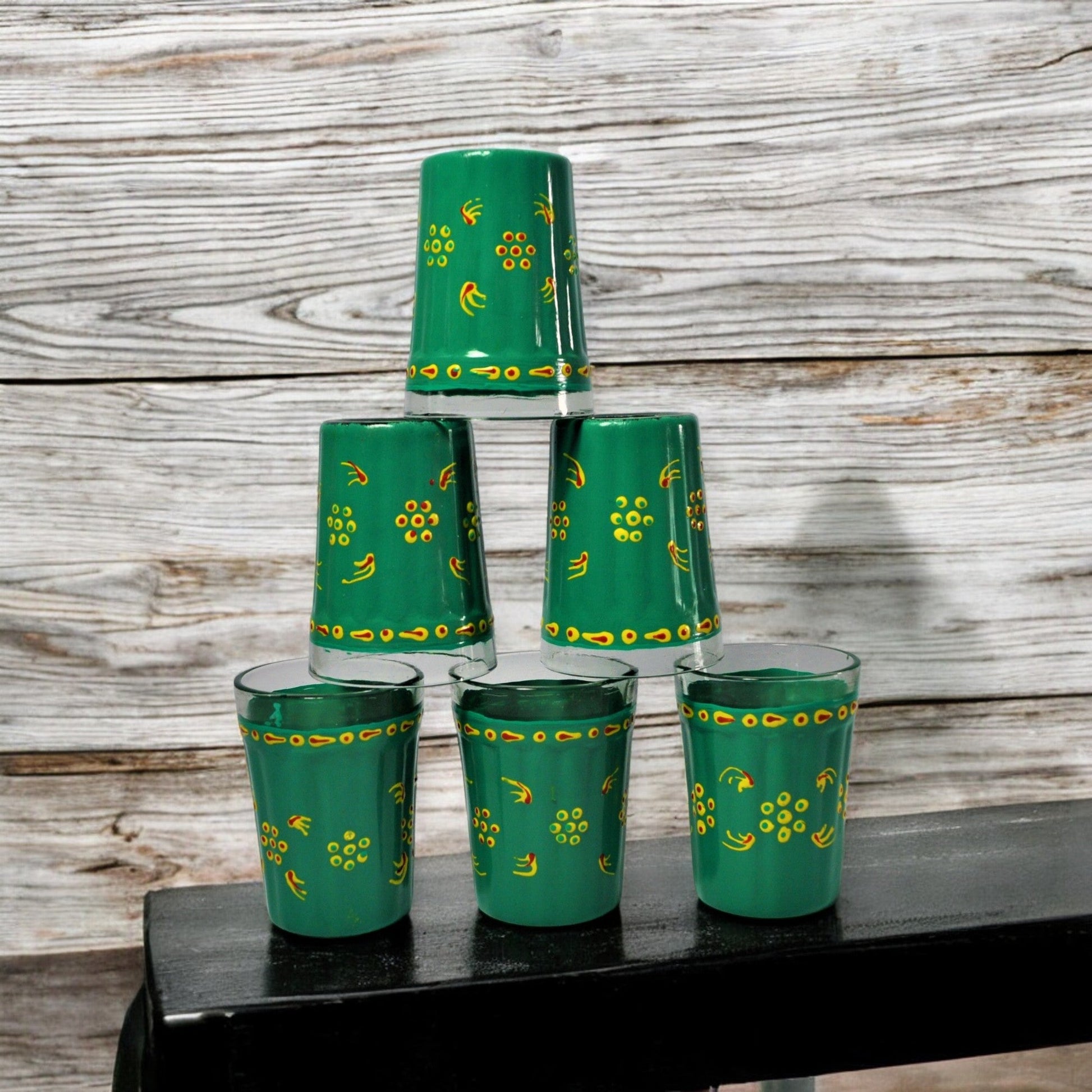 This tea kettle set is a colorful and eye-catching addition to any kitchen. The kettle is made of aluminum and features a hand-painted green design. It sits on a jute stand, which adds a natural touch. The set also includes Six green glasses, perfect for enjoying a cup of tea.