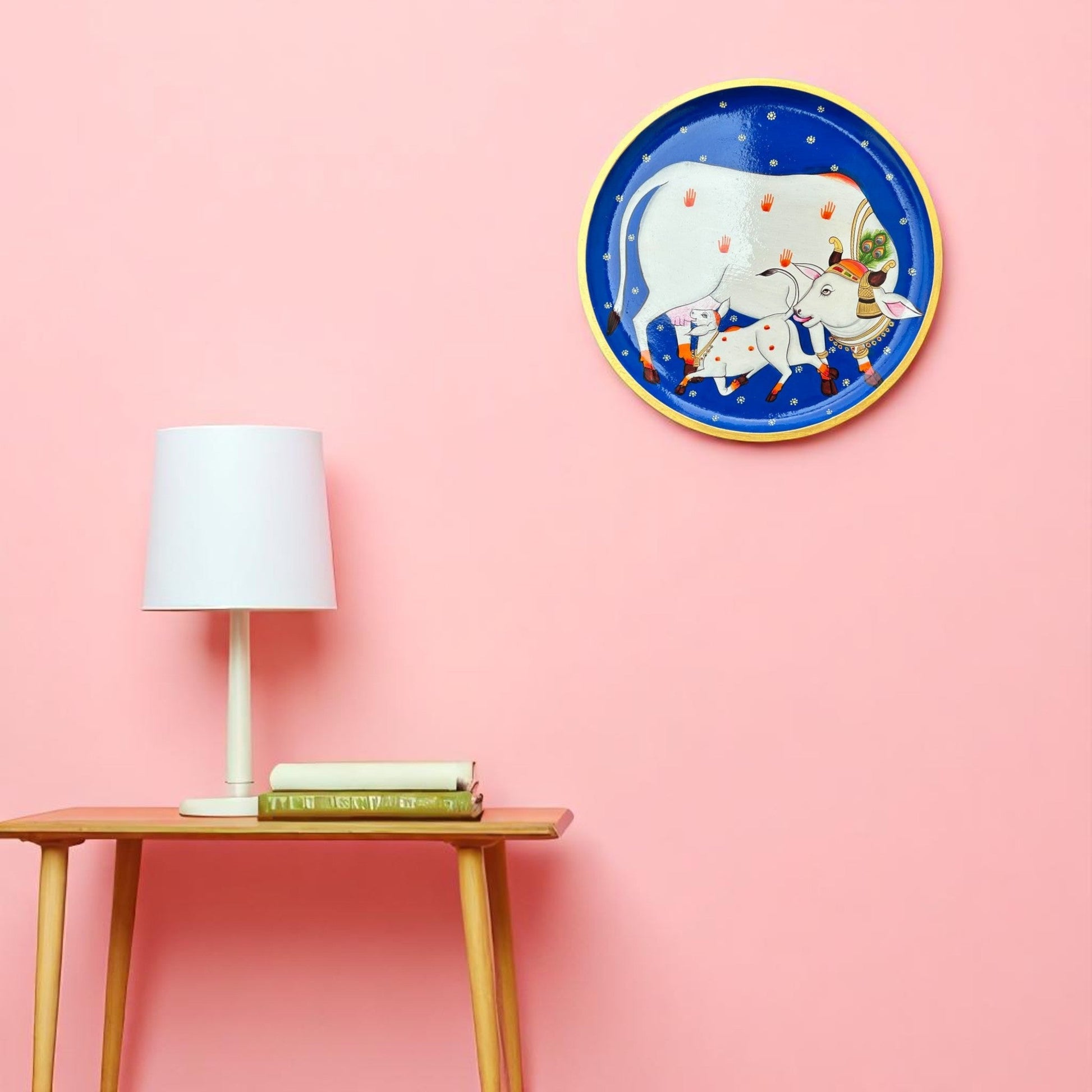 Hand-Painted Pichwai Divine Cow & Calf Wall Plate White Speckles Stars