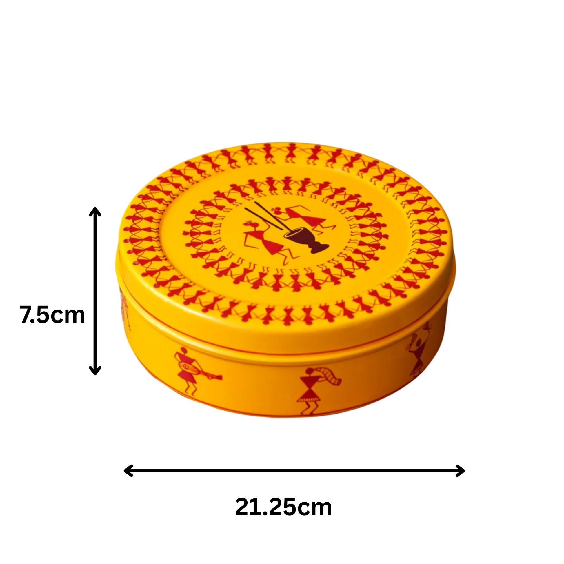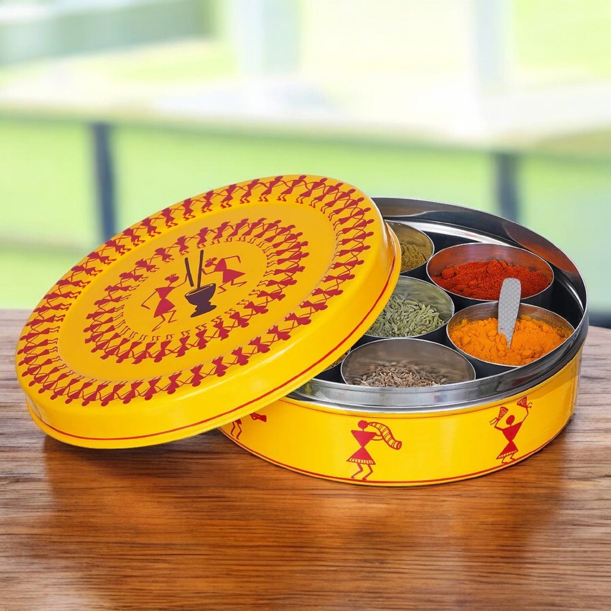Crafted from durable stainless steel and finished with a smooth coating, this round spice box contains seven individual compartments, perfect for storing a variety of your essential spices. The snug-fitting lid helps to keep your spices fresh and aromatic. The highlight of this spice box is its unique hand-painted artwork, showcasing traditional Indian folk art motifs in contrasting colors.
