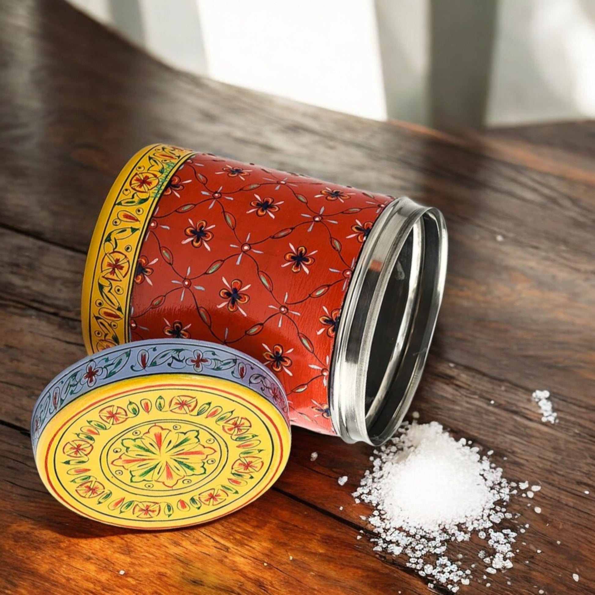 Bring a touch of timeless elegance and practical storage to your home with this hand-painted steel storage container. This piece is more than just a container; it's a work of art, meticulously handcrafted from durable steel and adorned with a captivating blend of traditional motifs and vibrant colors. The warm, earthy orange backdrop serves as the perfect canvas for the intricate floral and geometric patterns, showcasing the skill and artistry of the painter. The design, featuring stylized blossoms and delicate detailing, evokes a sense of classic charm while remaining versatile enough to complement any décor. Beyond its aesthetic appeal, this container is a reliable storage solution. Ideal for preserving the freshness of dry goods in your pantry, organizing tea or coffee in your kitchen, or even adding a decorative touch to your living space, this hand-painted container seamlessly marries beauty and functionality. The secure lid helps keep your contents fresh and protected. Invest in a piece that adds character and practicality to your home.