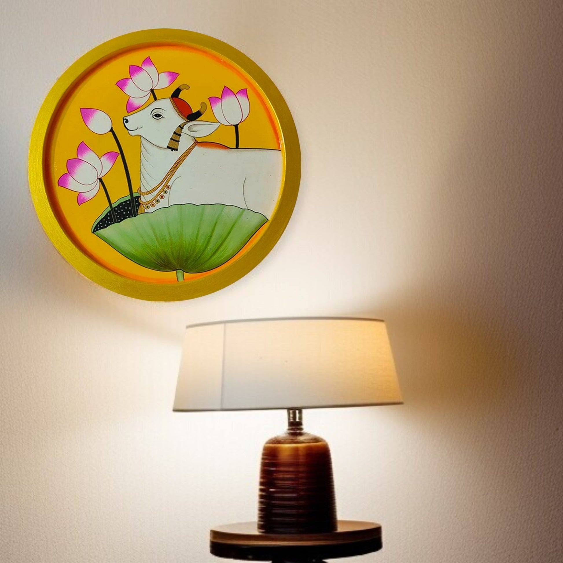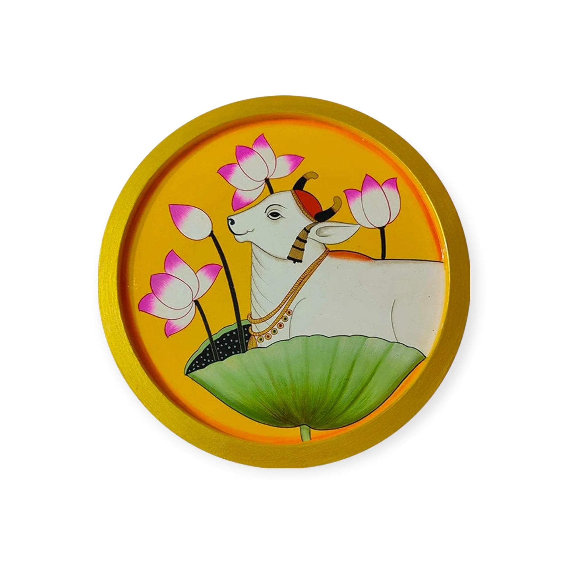 Introduce a touch of spiritual tranquility and artistic grace to your home with our "Hand-Painted Wooden Plate: Cow in Lotus Pond Round Décor." This beautifully crafted round wooden plate showcases a serene depiction of a revered cow, gently resting amidst a vibrant lotus pond. The artwork captures the cow's gentle demeanor, adorned with subtle embellishments, while surrounding lotus flowers in shades of pink and white bloom gracefully from a large green lotus leaf. All of this artistry is set against a warm, sunny yellow background and encased in a complementary golden frame, creating a harmonious and uplifting visual. Hand-painted by skilled artisans, this piece is not just decor but a reflection of traditional Indian artistry and symbolism, making it an ideal accent for your living room, meditation space, or as a cherished gift.