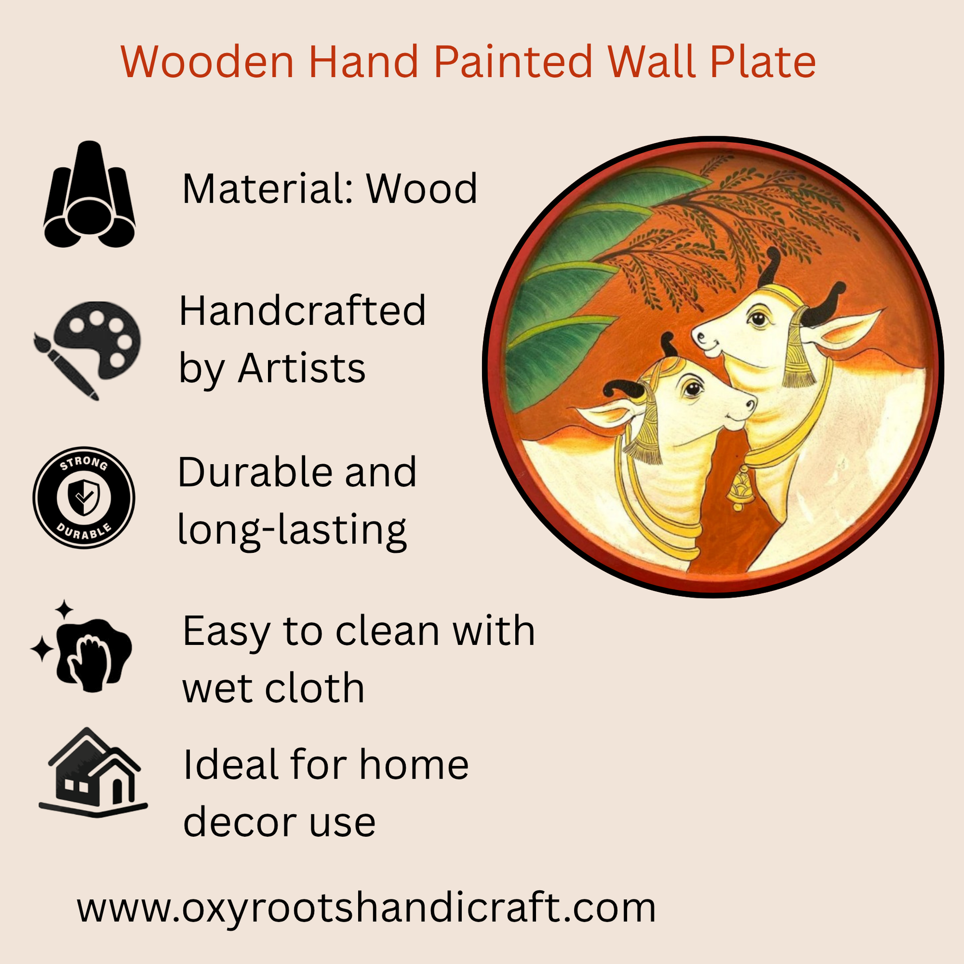 Bring home the serene charm of Indian folk art with this beautifully hand-painted wooden wall plate. Featuring a gentle white cow adorned with traditional embellishments, set amidst a backdrop of delicate pink lotus flowers and lush green leaves, this round plate is a testament to skilled craftsmanship. The artistic style is reminiscent of Pichwai paintings, known for their devotion to Krishna and the sacred cow. With its soothing colors and auspicious imagery, this wall plate is perfect for adding a touch of tranquility, cultural richness, and aesthetic appeal to any room in your home.