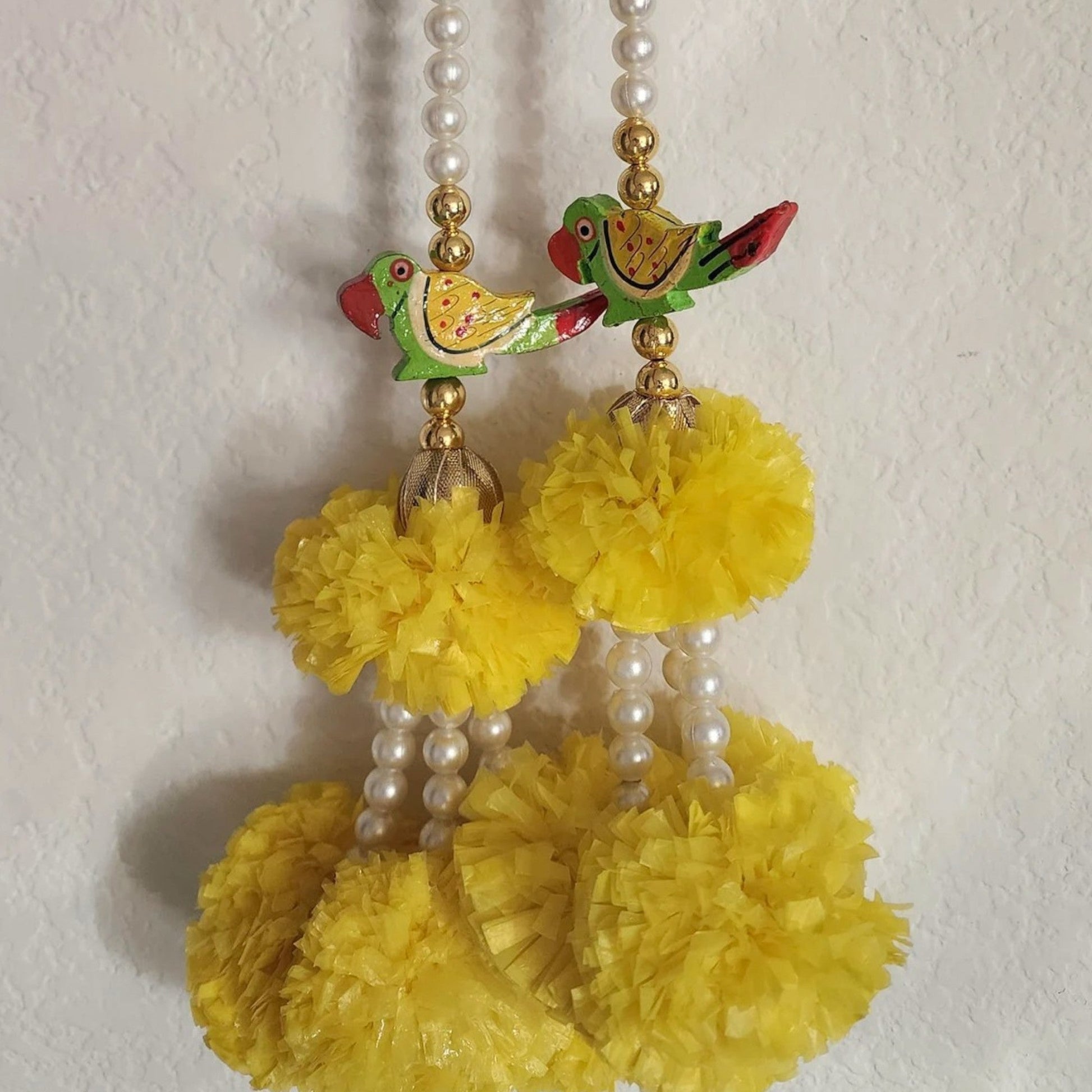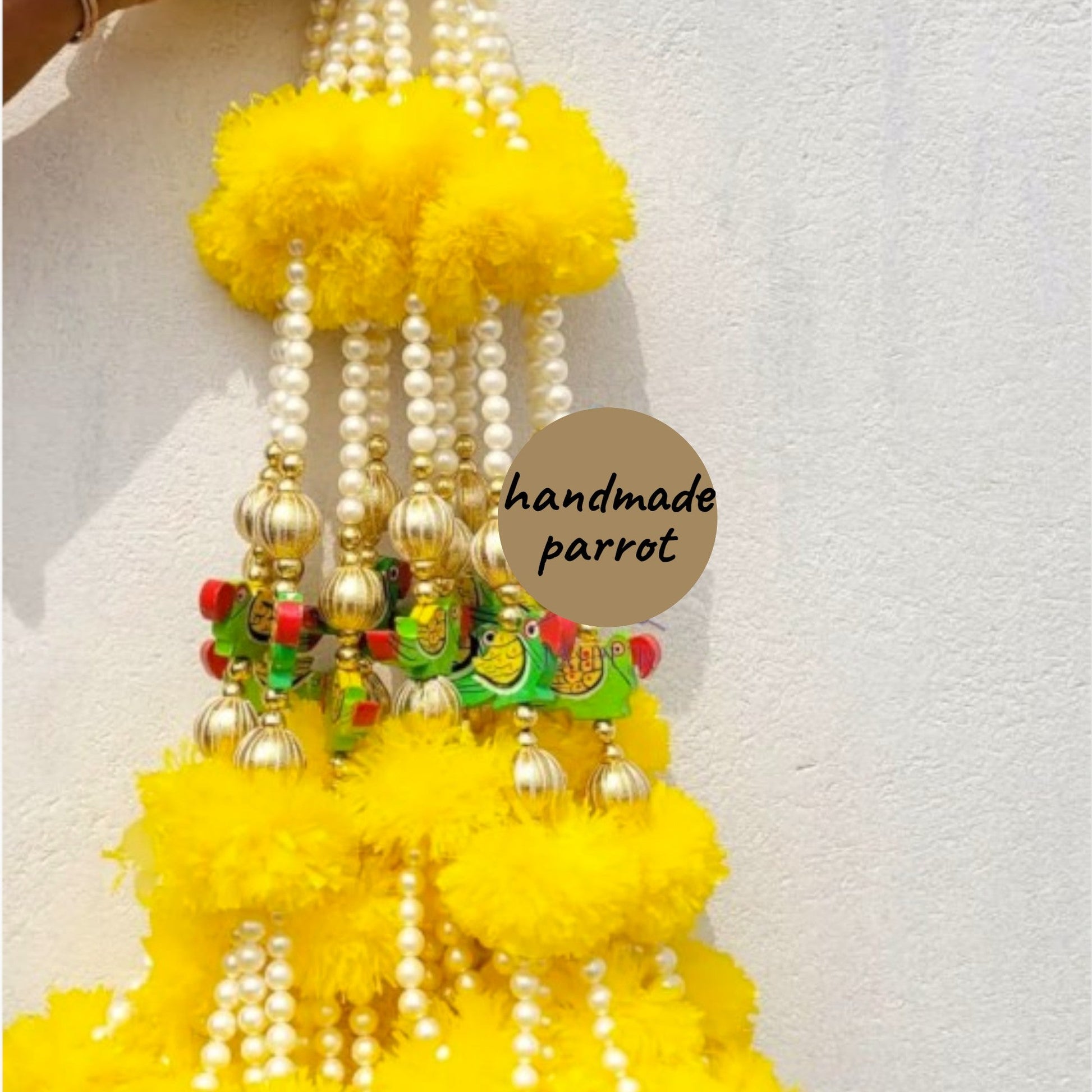 Bring a festive and vibrant atmosphere to your home with these beautiful Handmade Artificial Marigold Flower with Parrot Wall Hangings. These traditional Indian-style garlands are meticulously handcrafted, featuring a delightful combination of soft, fluffy yellow pom-poms that resemble marigold flowers. Interspersed among the flowers are hand-painted wooden parrots and lustrous golden beads, all strung together on delicate strands of white beads. Designed to be hung on doorways, windows, or as wall decor, these hangings add a touch of cultural charm and celebratory flair. They are perfect for special occasions, festivals like Diwali, weddings, or simply to brighten up your living space with their cheerful colors and unique, artistic design.