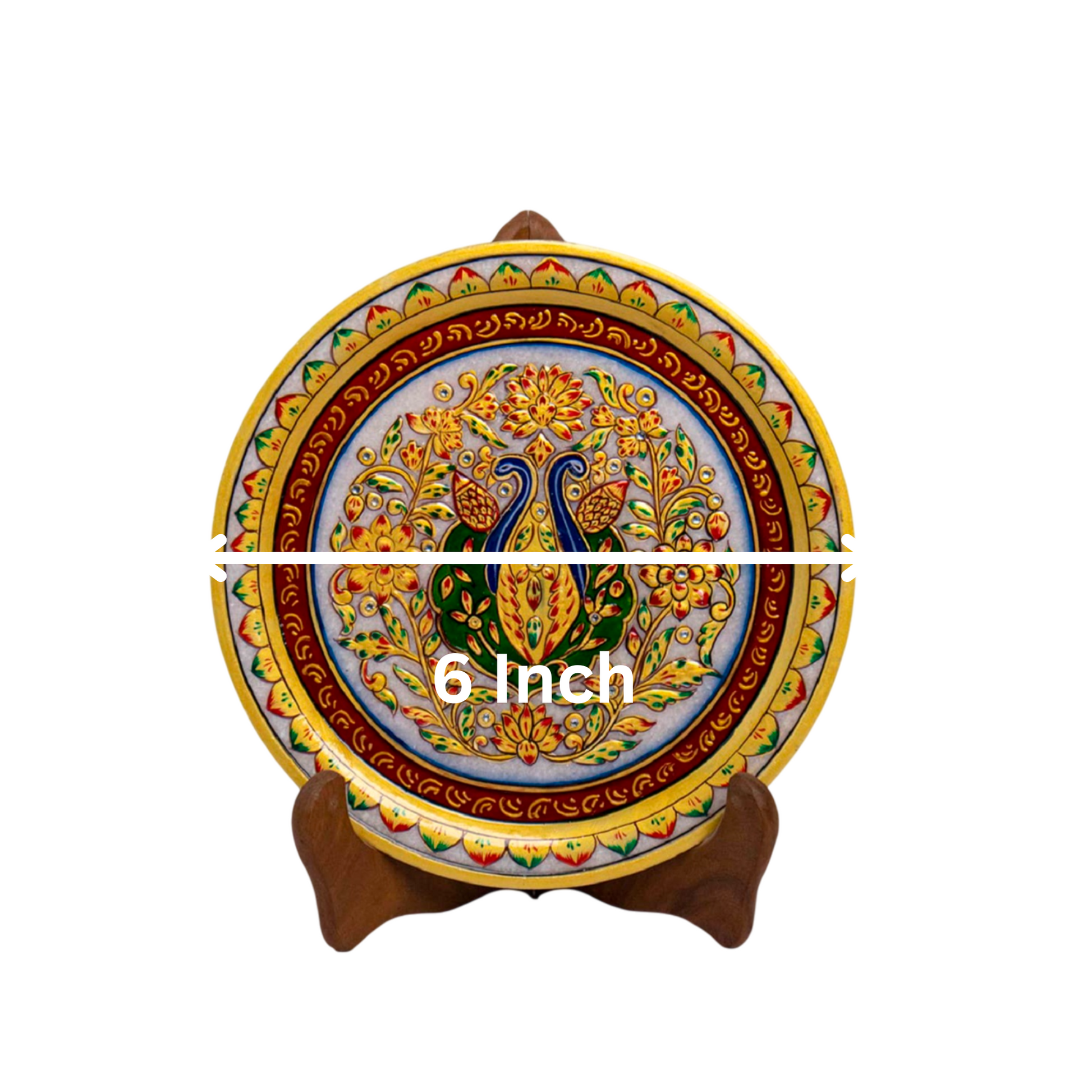 This beautiful marble plate is a unique piece of art that will add a touch of elegance and sophistication to any home. The plate is made of high-quality marble and features a stunning peacock design with intricate gold leaf detailing. The plate comes with a wooden stand for easy display.