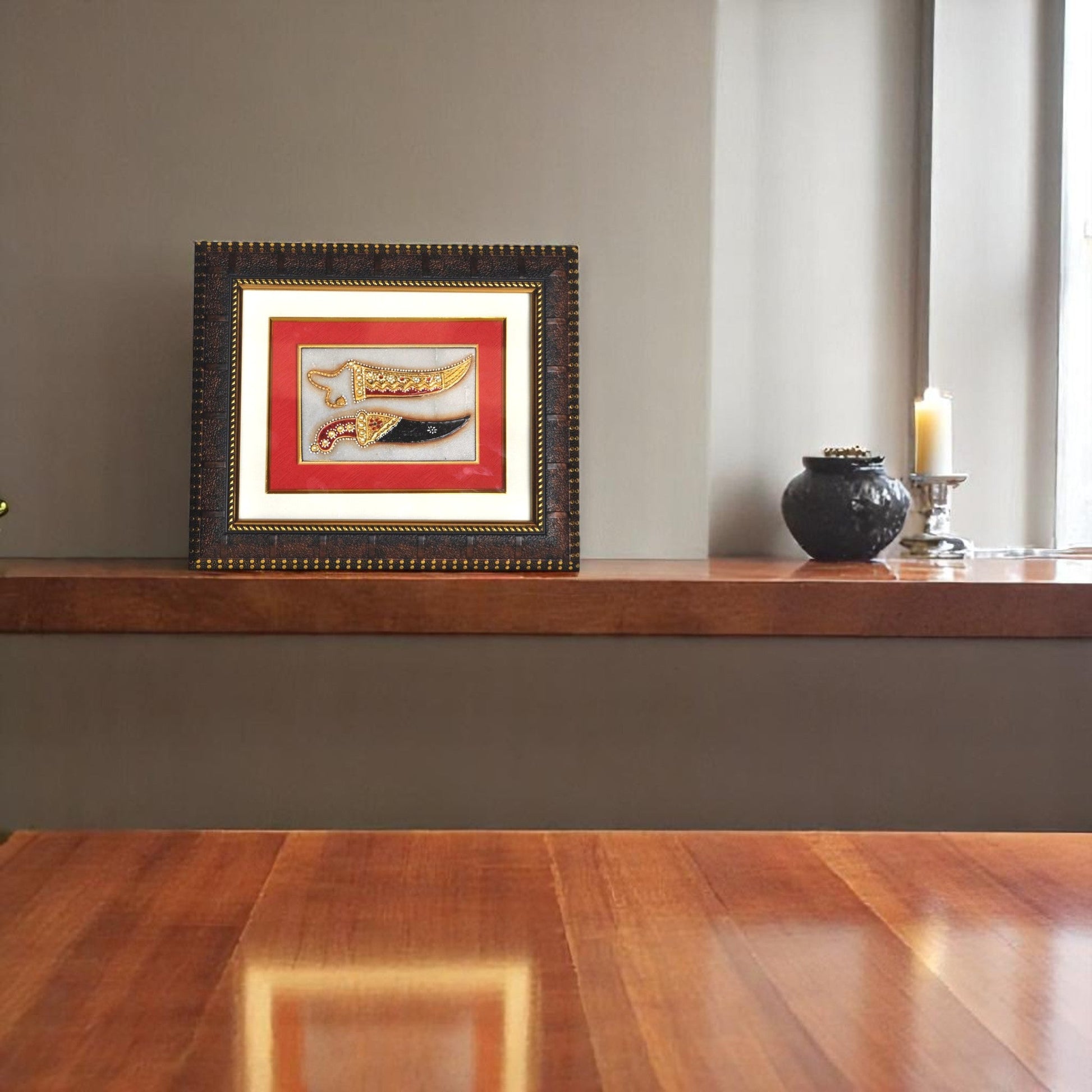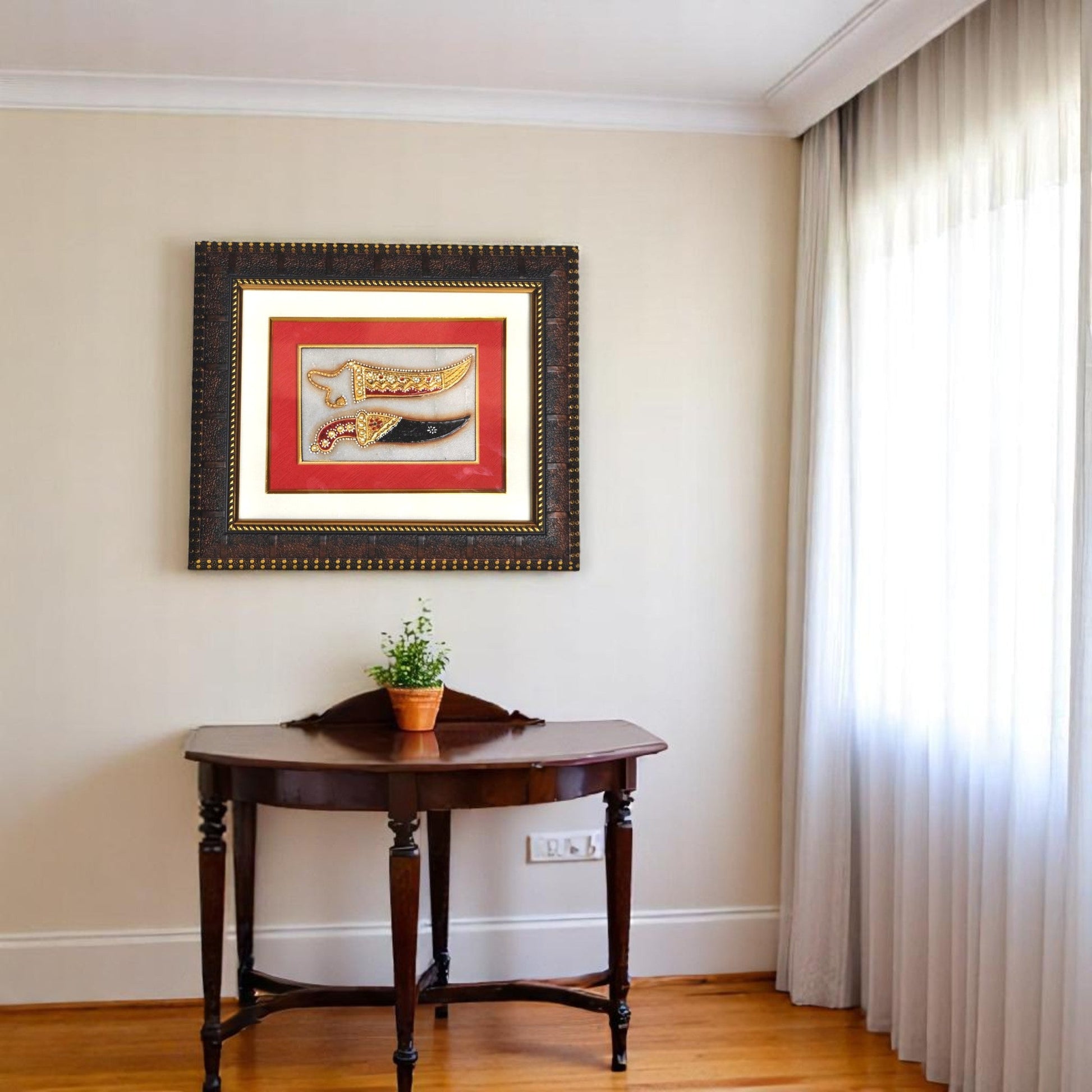 Add a touch of historical artistry and regal charm to your home with this striking Marble Dagger Painting Wall Hanging. This unique piece features a detailed depiction of traditional daggers, meticulously painted onto a smooth marble surface. The sharp lines and ornate embellishments of the daggers are brought to life with rich colors and careful craftsmanship. Framed for easy display, this wall hanging makes a bold and distinctive statement in any room. The cool elegance of the marble provides a sophisticated backdrop for the powerful imagery of the daggers, creating a captivating piece of art that sparks conversation and adds character to your décor.