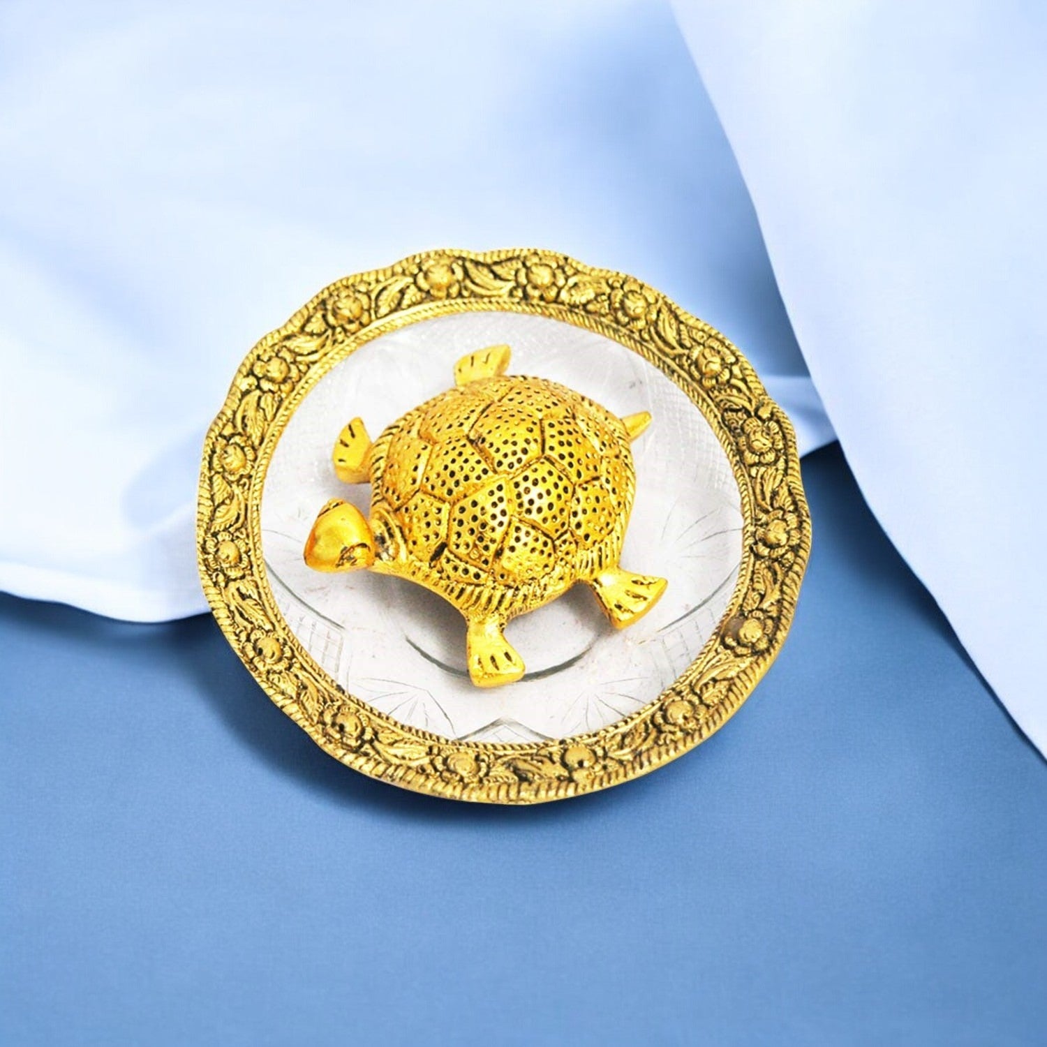 Golden Metal Tortoise on Glass Plate -This elegant golden metal tortoise on a glass plate is more than just a decorative piece; it's a powerful symbol of longevity, good luck, and prosperity in feng shui. The tortoise is revered in many cultures for its wisdom, strength, and resilience, and its presence in your home is believed to attract positive energy and blessings.
