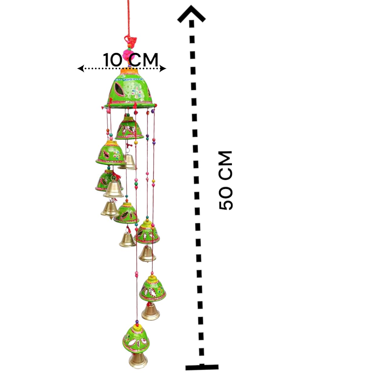 This vibrant Green jhoomar wind chime is a decorative and eye-catching addition to any home. The wind chime is crafted from metal and features a tiered design with multiple bells and Green beads. As the wind blows, the chimes create a gentle and melodic sound.