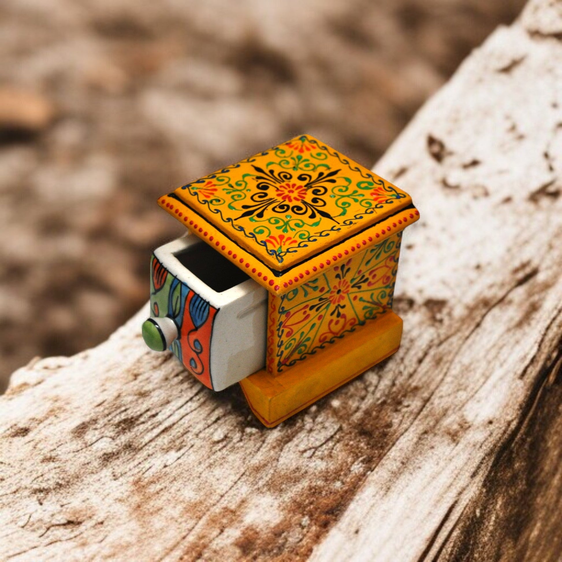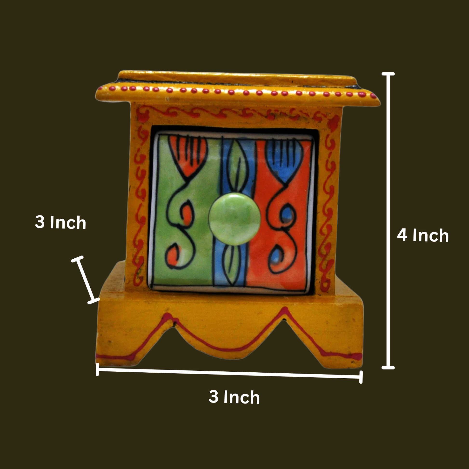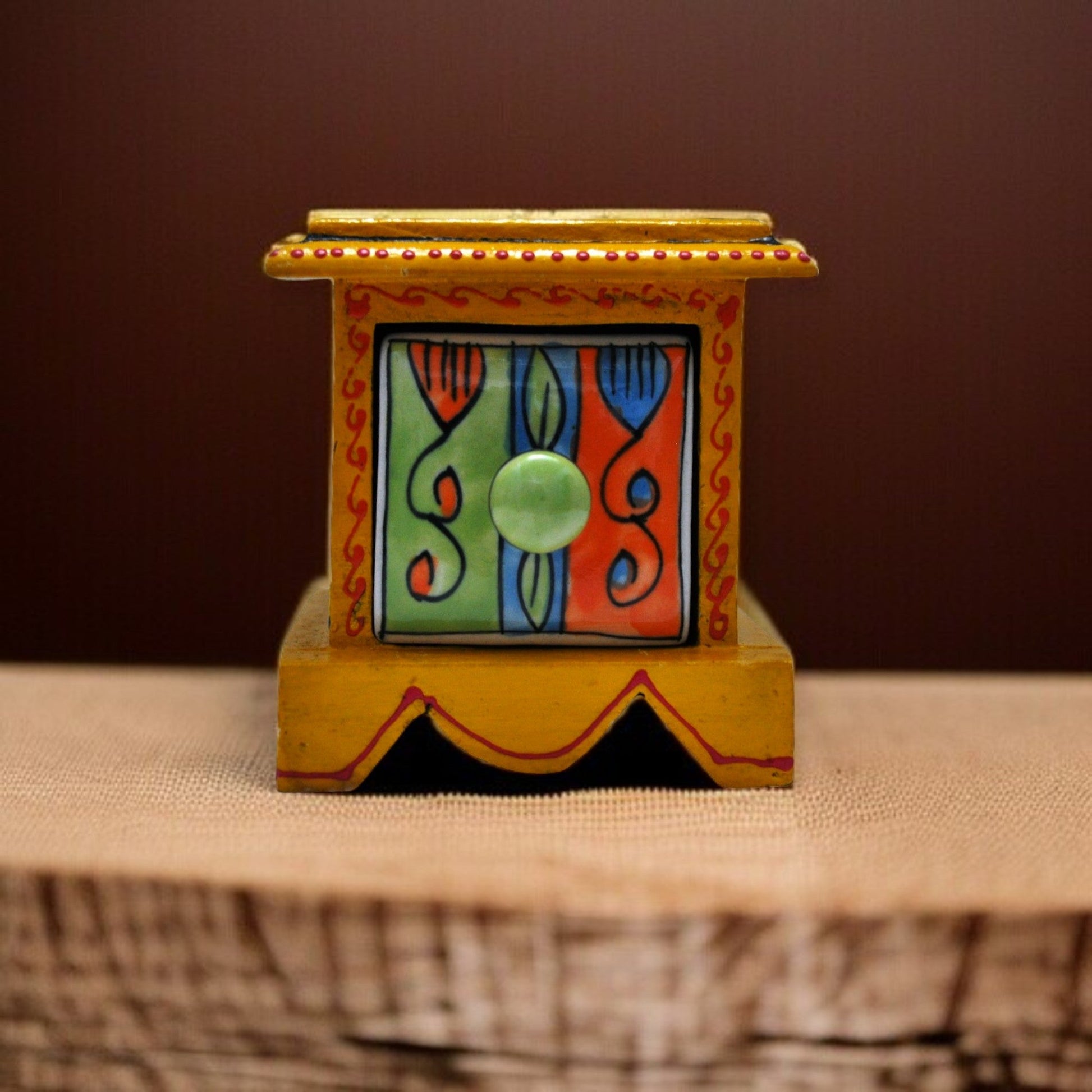 Yellow Wooden Ceramic Drawer Chest with 1 Drawers This eye-catching Yellow wooden ceramic drawer chest adds a pop of color and playful sophistication to any room. The unique combination of smooth ceramic drawers and rustic wooden frame creates a striking contrast that's both modern and timeless. With four spacious drawers, this chest offers ample storage for anything from jewelry and keepsakes to office supplies and linens.