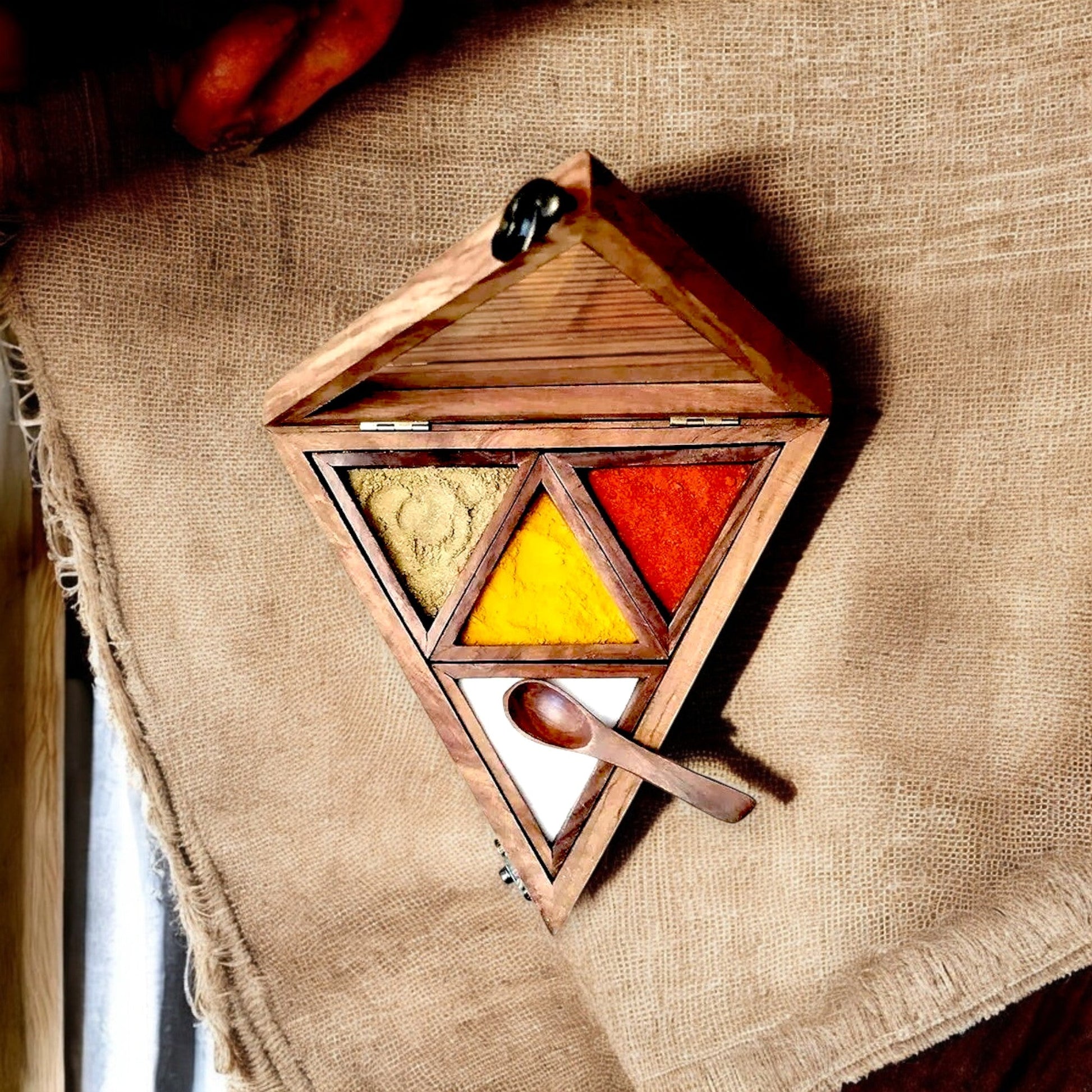 This beautiful spice box is made of wood (possibly sheesham wood) and features a clear glass lid for easy viewing of your spices. It has Four removable compartments, perfect for storing a variety of spices, herbs, and other seasonings. The box also includes a small wooden spoon for scooping out spices.