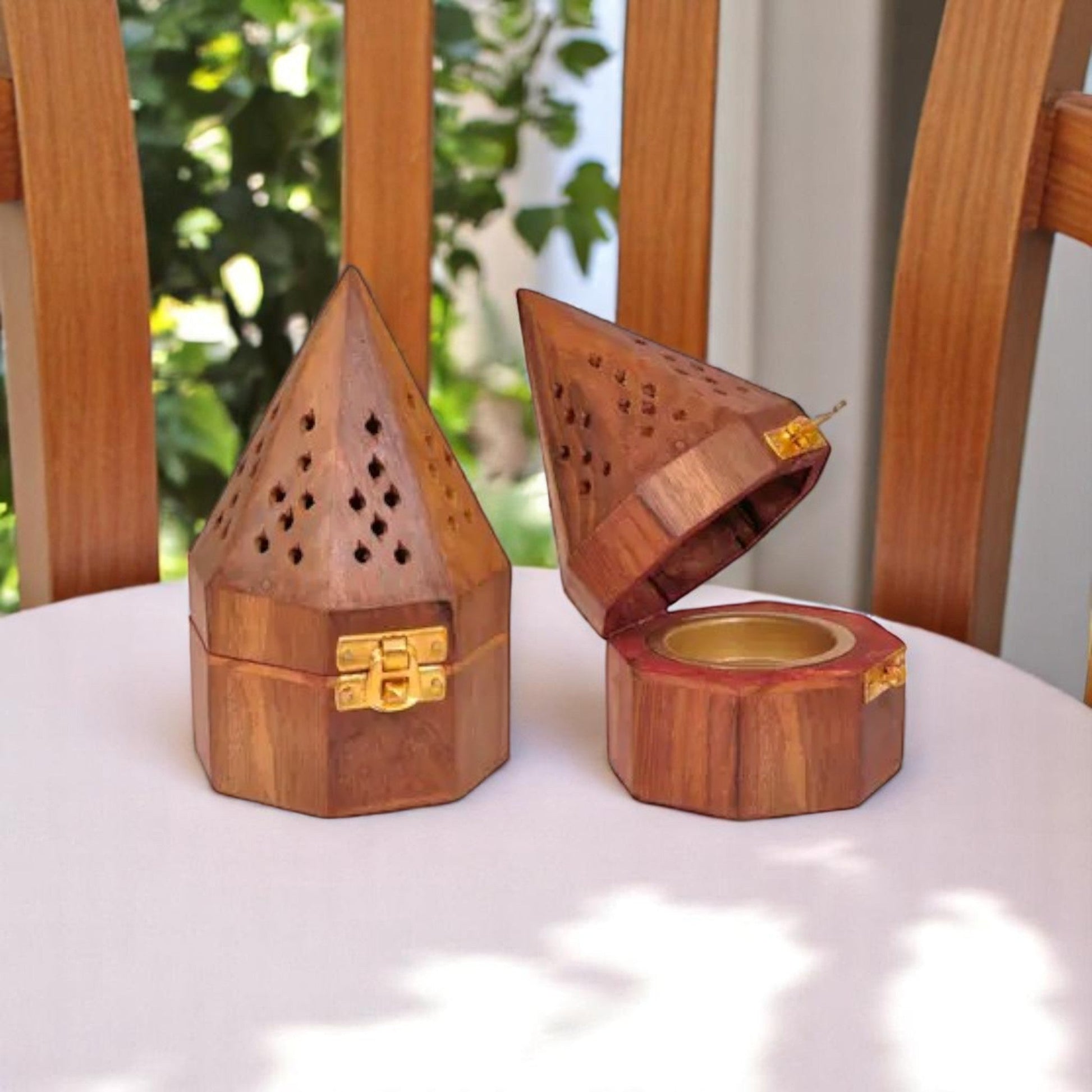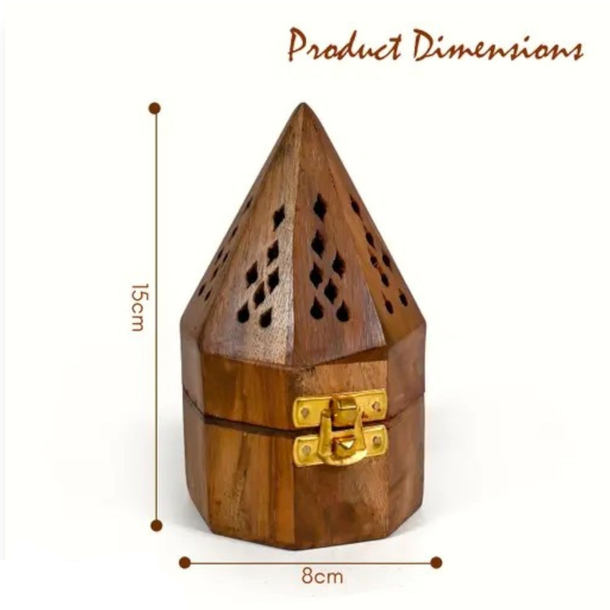Elevate your spiritual practices or simply add a touch of rustic charm to your home décor with this beautifully crafted Wooden Dhoop Dani Stand. This round-shaped incense holder is designed to safely and elegantly burn dhoop cones, creating a fragrant and serene ambiance in your space. Made from durable and ethically sourced wood, its natural grains and warm tones add an earthy aesthetic. The lid features intricate cut-outs that allow the aromatic smoke to disperse gracefully, while also providing proper ventilation for efficient burning. This dhoop dani is not only functional but also serves as a charming decorative piece, perfect for your puja room, meditation corner, or as a thoughtful gift for those who appreciate natural craftsmanship and aromatic experiences.