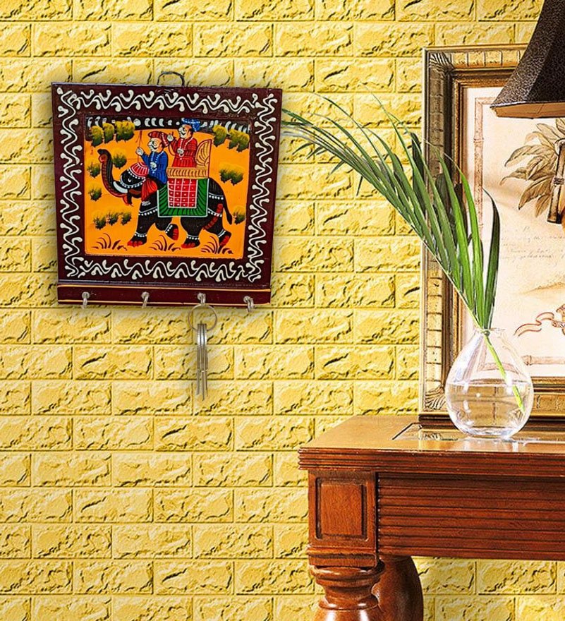 This charming hand-painted wooden key holder adds a touch of whimsy and functionality to your entryway. The key holder is crafted from wood and features a colorful Black background with a possible floral or geometric design. It has four metal hooks for hanging keys, lanyards, dog leashes, or other small items.