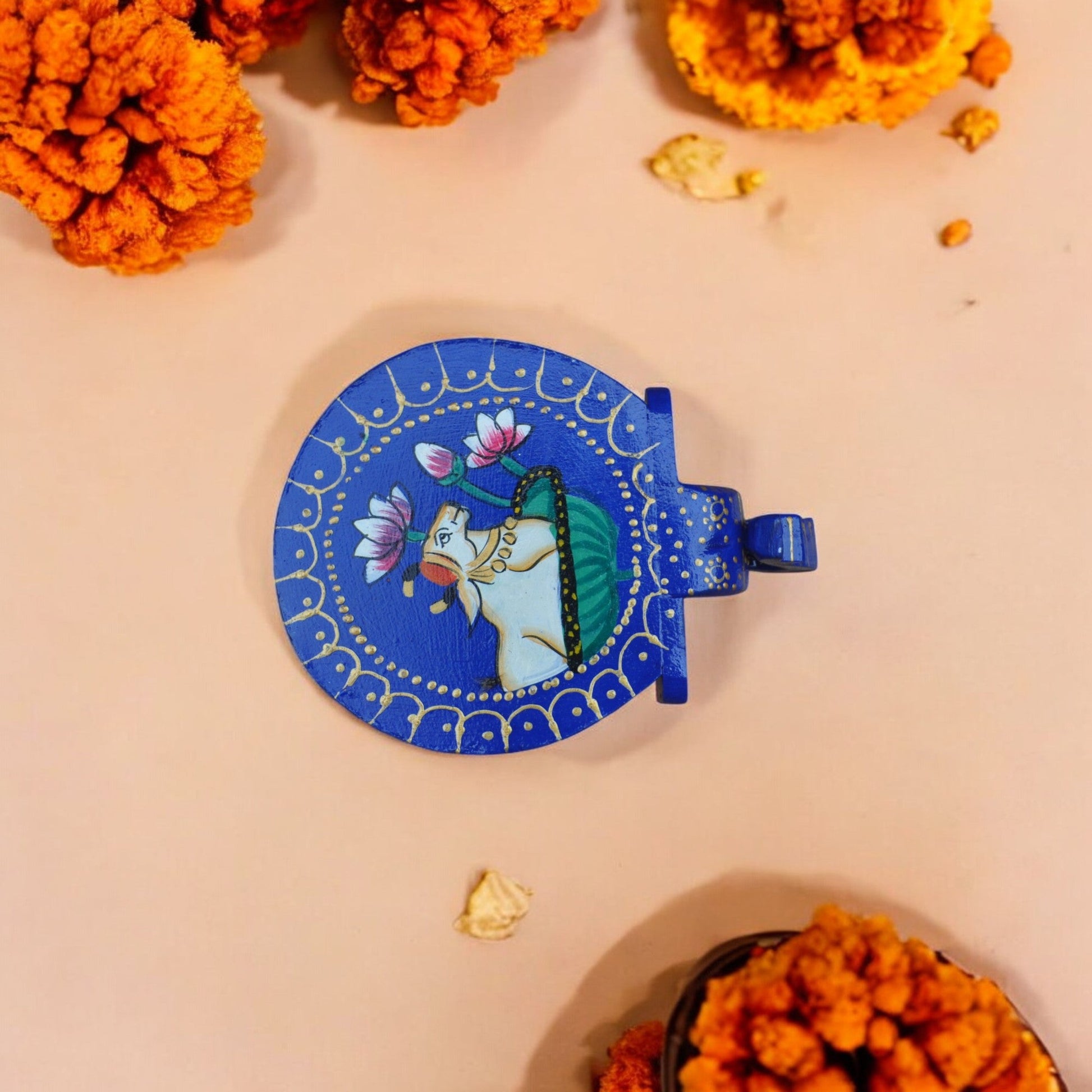 Add a touch of vibrant artistry and whimsical charm to your home with our exquisite Wooden Hand Painted Elephant Stool in brilliant blue. Meticulously crafted from high-quality wood, this unique stool is more than just a functional piece; it's a miniature work of art. The rich blue base is adorned with intricate hand-painted details, featuring golden accents and a delightful scene on the seat that captures the essence of traditional Indian craftsmanship. The sturdy elephant-shaped legs provide stable support while adding an adorable character to the design. Perfect as a decorative accent, a unique side table for small items, or even a charming plant stand, this elephant stool brings a burst of color and cultural elegance to any room. It's an ideal gift for art lovers, those who appreciate handmade treasures, or anyone looking to infuse their space with a touch of playful sophistication.