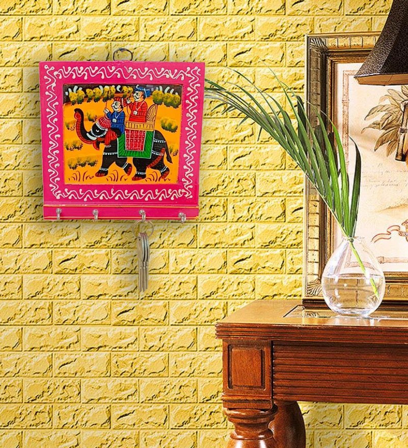 This charming hand-painted wooden key holder adds a touch of whimsy and functionality to your entryway. The key holder is crafted from wood and features a colorful Pink background with a possible floral or geometric design. It has four metal hooks for hanging keys, lanyards, dog leashes, or other small items.