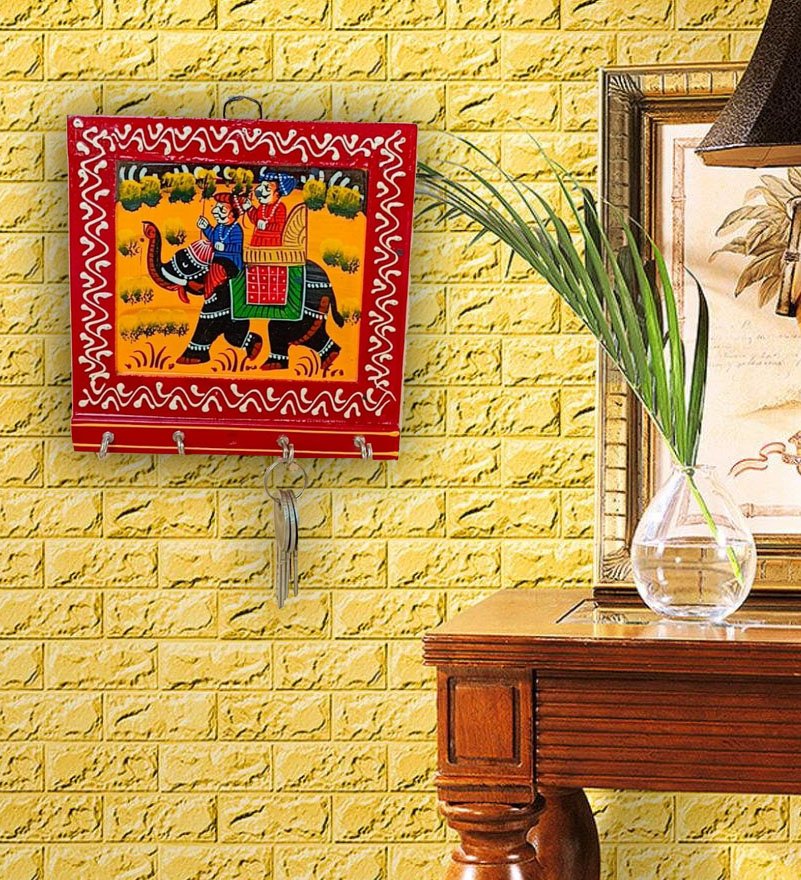 This charming hand-painted wooden key holder adds a touch of whimsy and functionality to your entryway. The key holder is crafted from wood and features a colorful Red background with a possible floral or geometric design. It has four metal hooks for hanging keys, lanyards, dog leashes, or other small items.