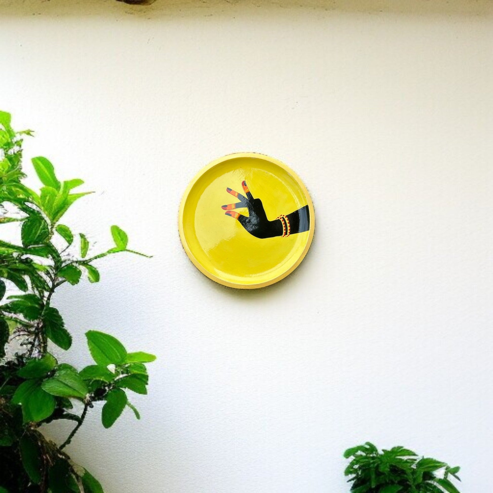 Infuse your living space with the grace and expressiveness of traditional Indian dance with our exquisite Wooden Hand-Painted Round Plate. This striking wall art piece features a beautifully rendered hand in a classical mudra, a symbolic gesture often seen in Indian classical dance forms like Bharatanatyam or Kathak. The deep black silhouette of the hand, adorned with vibrant red and gold accents reminiscent of traditional jewelry and alta (a red dye used to decorate hands and feet), stands out dramatically against a brilliant, sunny yellow background. Crafted by skilled artisans, this unique plate captures the elegance and cultural richness of India, making it a captivating addition to any room. It's a perfect blend of artistic expression and traditional Indian craftsmanship, bringing the spirit of performance and devotion into your home.