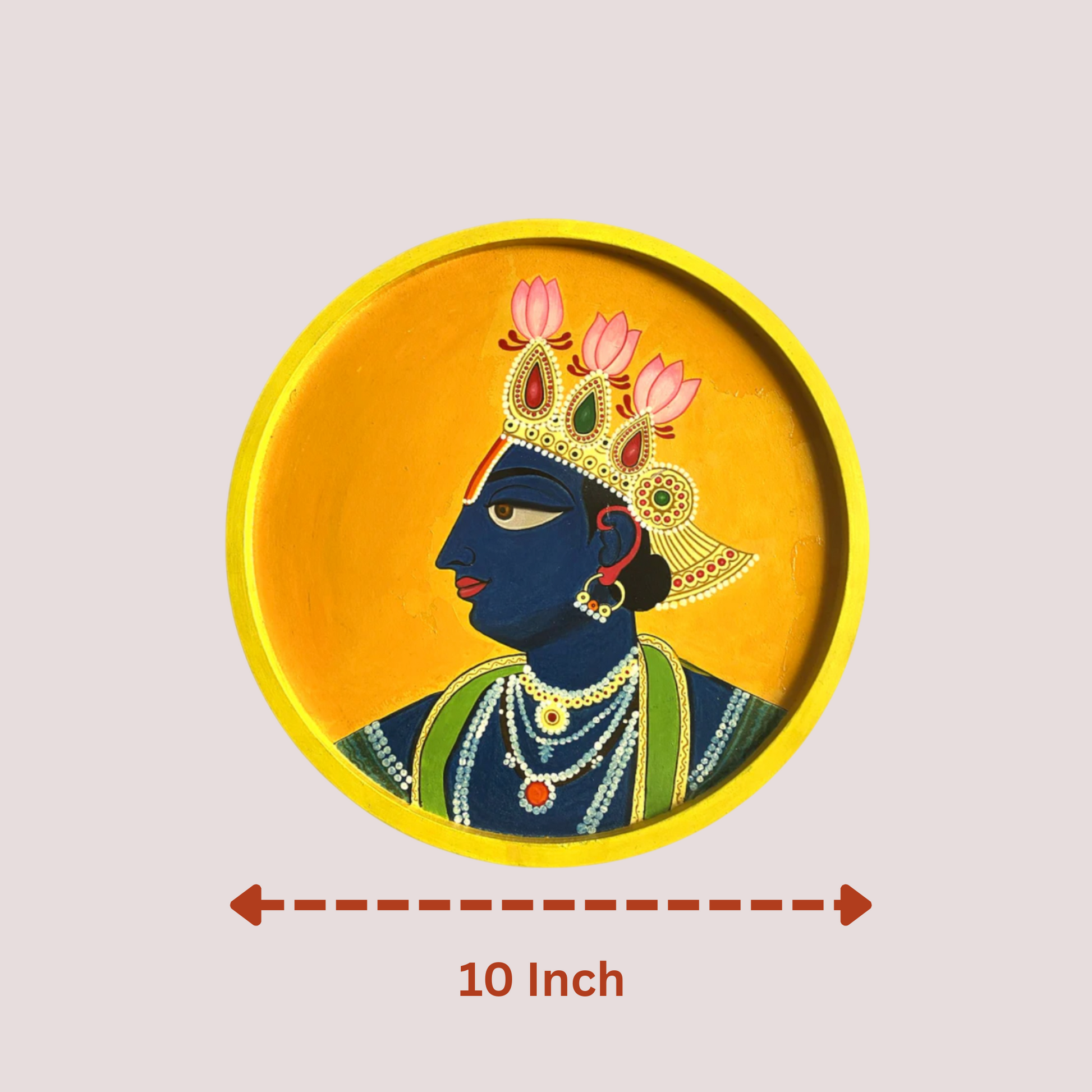 Bring divine elegance to your home with our exquisite Wooden Hand-Painted Round Plate featuring a captivating depiction of Lord Krishna. This vibrant wall art piece is meticulously crafted and hand-painted by skilled artisans, showcasing the serene and iconic form of Krishna Ji in rich detail. The deep blue hue of Krishna's skin, adorned with a golden crown featuring delicate lotus motifs, and intricate traditional jewelry, stands out beautifully against the bright, sunny yellow background. Perfect for adding a touch of spirituality and traditional Indian artistry to any living space, this round plate serves as a unique wall decor item or a thoughtful gift for devotees and art lovers alike.
