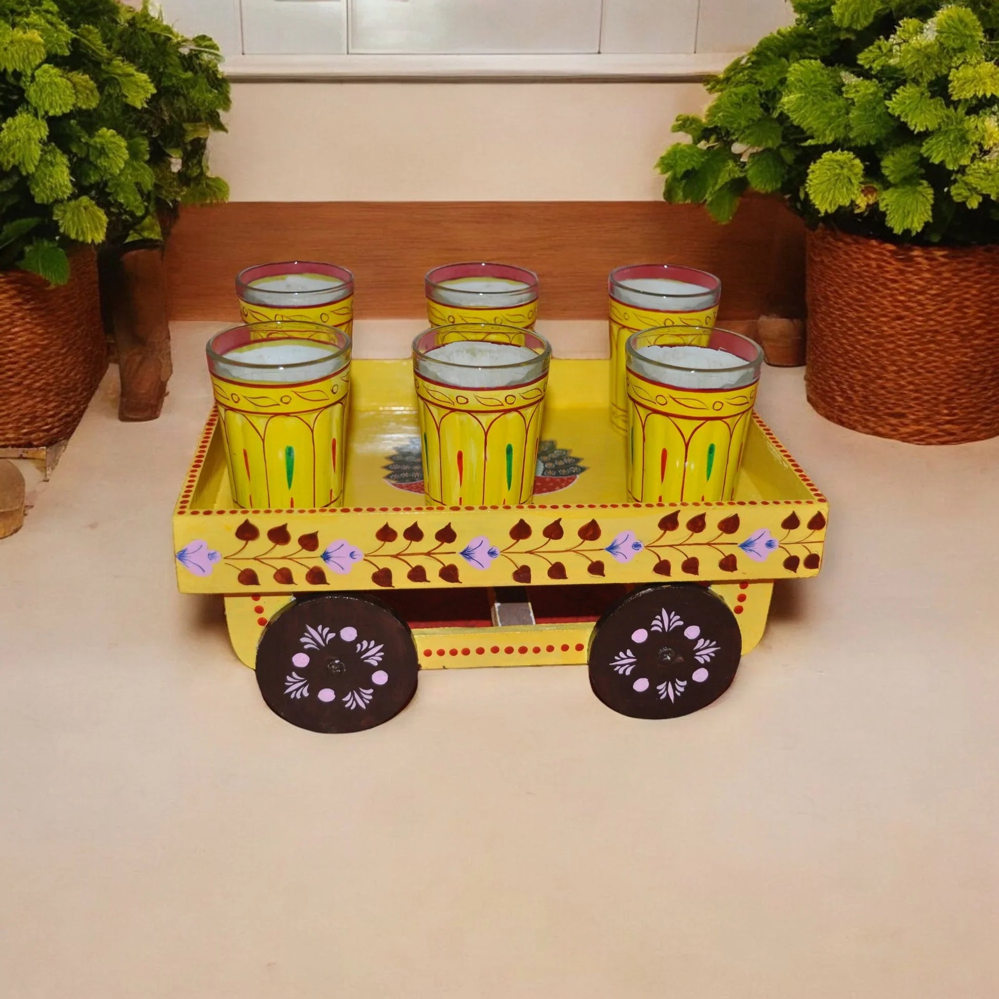 Bring a touch of vibrant Indian charm to your home with this exquisite hand-painted wooden tea serving table trolley. Crafted from sustainably sourced wood and adorned with intricate floral and paisley motifs in a captivating shade of Yellow, this trolley is not just functional, but a work of art.