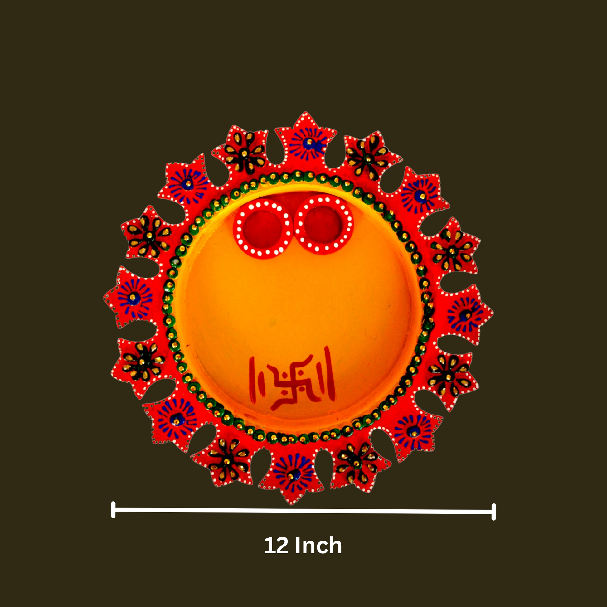 This vibrant and intricately designed Wooden Pooja Thali is a handcrafted masterpiece, perfect for your religious rituals and celebrations. The thali is adorned with colorful hand-painted designs, featuring a Swastika symbol and a central space for diyas. Embellished with sparkling beads and intricate patterns, this thali adds a touch of festive cheer and spirituality to your home decor.