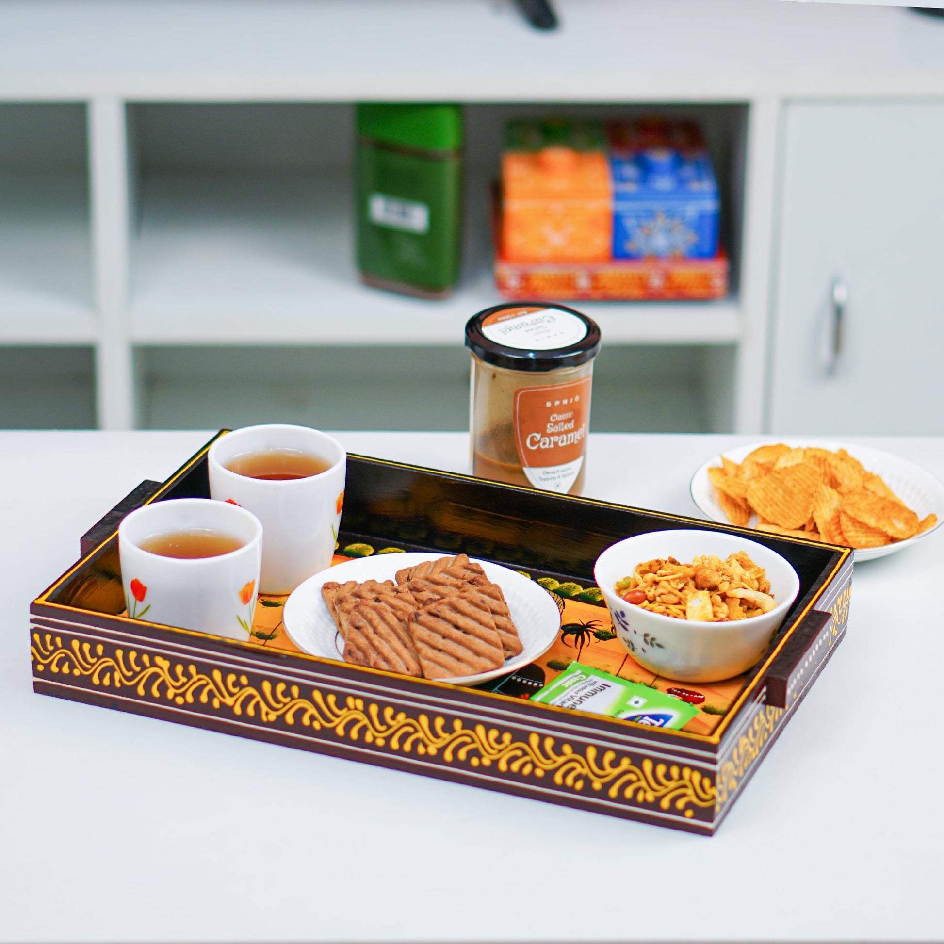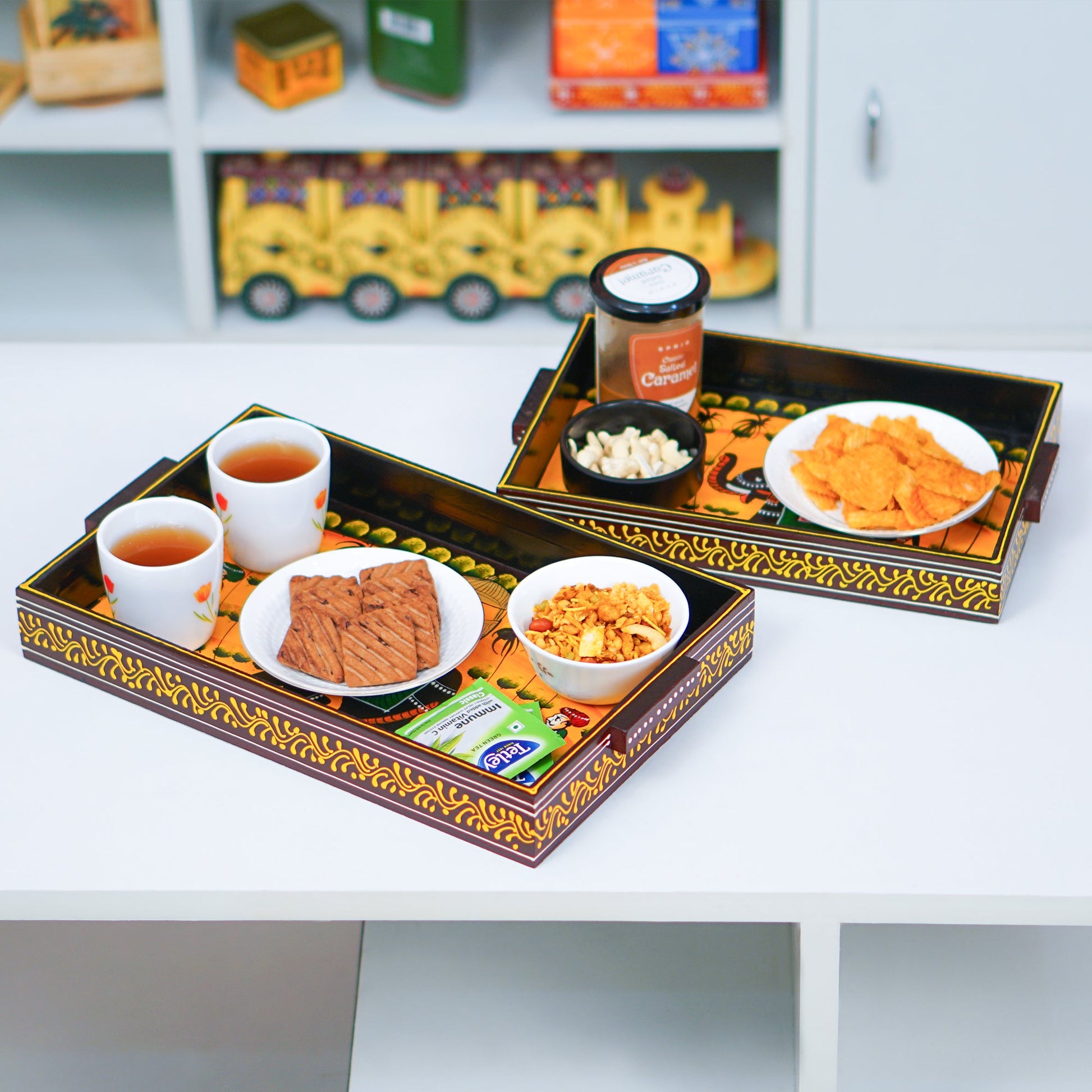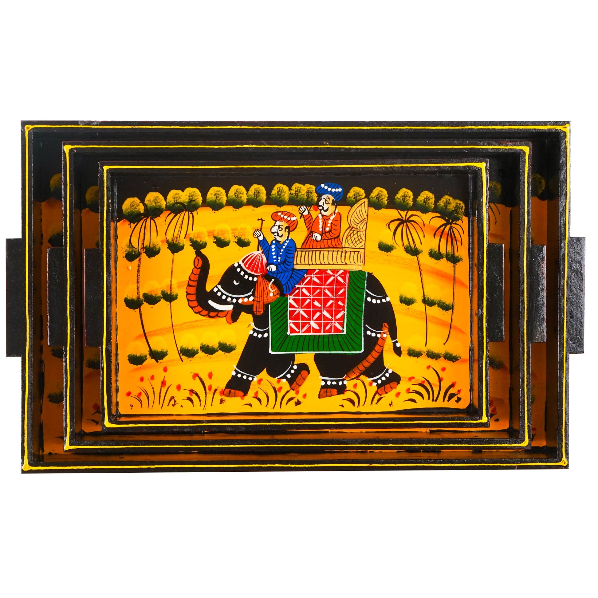 This set of Three wooden serving trays is hand-painted with a colorful and intricate design featuring an elephant with a rider. The design evokes a sense of exploration and adventure. The trays are made of high-quality wood and are sure to last for years to come. The vibrant colors and unique design make this a perfect conversation starter and a great way to add a touch of exotic flair to your home.